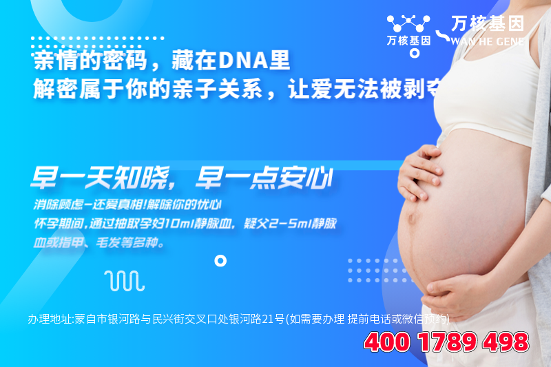 蒙自产前无创亲子鉴定办理地址:蒙自市银河路与民兴街交叉口处银河路21号(如需要办理 提前电话或微信预约)-预约电话:4001789498,可咨询鉴定类型包括:产前无创亲子鉴定、司法亲子鉴定、移民亲子鉴定、入户亲子鉴定、中考报告亲子鉴定、高考亲子鉴定、个人隐私亲子鉴定等等咨询服务和提供专业知识及答复,蒙自亲子鉴定基因检测是一家专为蒙自地区服务的亲子鉴定咨询机构。